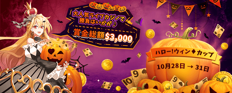 ハロウィンがもっと楽しくなる《ハロー!ウィン♦カップ》を開催します! 大人気ライブカジノで、賭け金$3以上の合計賭け金額勝負!